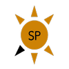 Logotipo com a palavra "SUDOESTE" em letras brancas, com um círculo marrom central contendo as letras "SP" e um sol estilizado dourado ao redor do círculo.